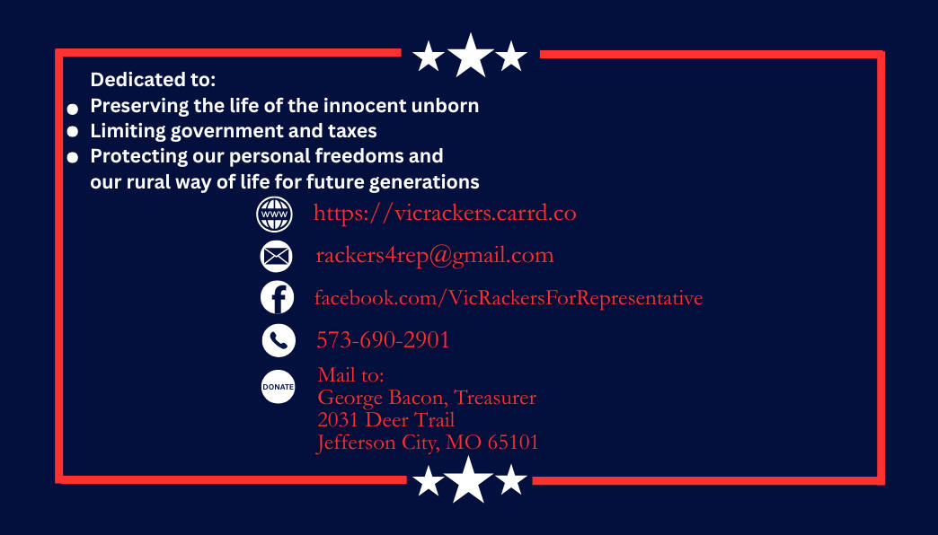 Rackers, 58, is a Cole County lifelong native who attended Immaculate Conception grade school, Jefferson City High School, and is a graduate of Missouri S&T. He is married to Eileen of thirty-five years and has three married children and four grandchildren. They also have a son and son-in-law serving in the military. Together both enjoy life on their farm where they hunt, raise cattle, make hay, and run horses on the east side of Cole County adjacent to the Moreau River.Vic is a retired civil engineer from the state where he developed infrastructure on MDC lands. He taught construction at State Tech, managed projects for Lincoln University, and reconstructed abandoned coal mine lands at DNR for private landowners throughout the state of Missouri before retiring in 2019.He is an active, informed, community minded citizen who is currently serving on multiple boards and has volunteered for many years at church and various organizations. Vic proudly serves on the Cole County Republican Central Committee, the MU Extension Council, Capital Chapter of the Missouri Right to Life, Knights of Columbus and the Bugle Boy Advisory Board.Vic is very active in the Pro-Life cause and believes every unborn child is entitled to their God given constitutional right to life. He stands for limiting government and taxes, promoting personal freedoms and protecting individual liberties. He believes the 2nd Amendment as well as the 1st should not be infringed upon. If elected Vic work to ensure the Republican led Missouri legislature will accomplish more to benefit its citizens and will work toward that goal. His life experiences of raising a family, working as an engineer throughout the state, farming, and volunteering will make him a great advocate, who is accessible and accountable at the Capitol for the citizens of the 59th District.